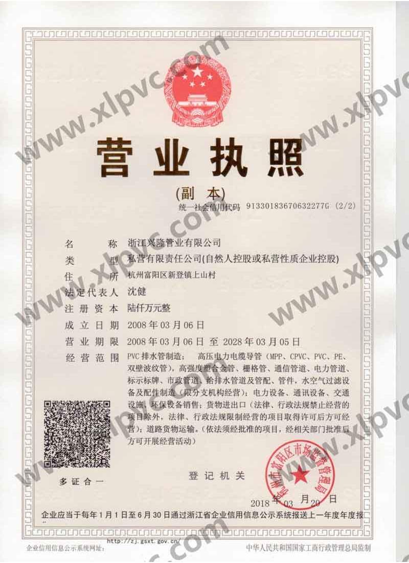 浙江興隆管業(yè)有限公司位于杭州市富陽區(qū)(杭州第九新區(qū)),坐落在新登鎮(zhèn),相距杭州僅60公里,水、陸、空交通運(yùn)輸十分便利。浙江興隆管業(yè)有限公司前身為富陽興隆塑料制品廠,成立于1992年,2008年改名浙江興隆管業(yè)有限公司,數(shù)十年來,公司一直至力于管道的生產(chǎn),目前公司擁有國內(nèi)先進(jìn)的CPVC保護(hù)管生產(chǎn)線,HPVC()雙壁波紋管生產(chǎn)線,多孔管生產(chǎn)線,玻璃鋼電纜保護(hù)管生產(chǎn)線、MPP電纜保護(hù)管生產(chǎn)線。生產(chǎn)的主要產(chǎn)品有:CPVC電纜保護(hù)管、MPP電力電纜保護(hù)管(頂管)、高強(qiáng)度塑合金管、HDPE給排水管、HPVC()雙壁波紋管、玻璃鋼電纜保護(hù)管、埋地通信用的PVC-U多孔管、PE直壁管、PVC-U雙壁波紋管、梅花管等,年生產(chǎn)能力達(dá)20000萬米。